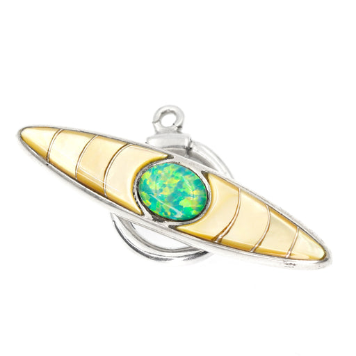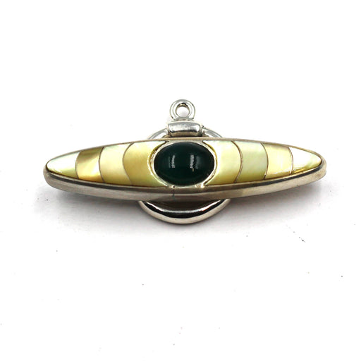 Average size is 42-44 mm long by 9mm wide. This Toggle has green opal at its core and gold lip mother of pearl surrounding it. The metal is sterlin...