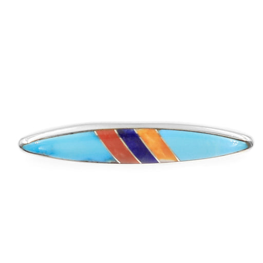 Measures 17mm x 34mm.  Features turquoise, spiny oyster and black onyx. Sterling silver. Has safety feature.