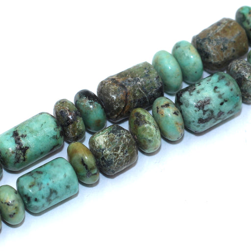 African Turquoise barrel roundelles in graduated sizes from 6mm to 8mm, strung on an 18-inch strand. These versatile beads feature the distinctive ...
