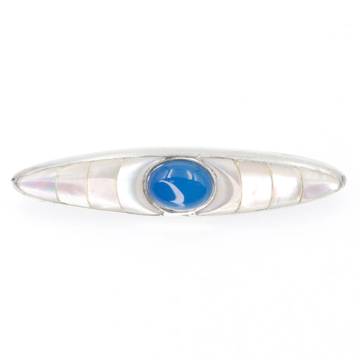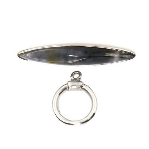 Average size is 42-44 mm long by 9mm wide. This Toggle has blue onyx at its core and mother of pearl surrounding it. The metal is sterling silver.