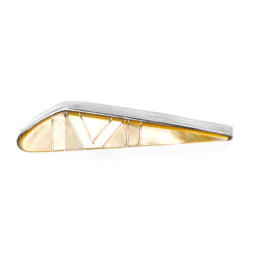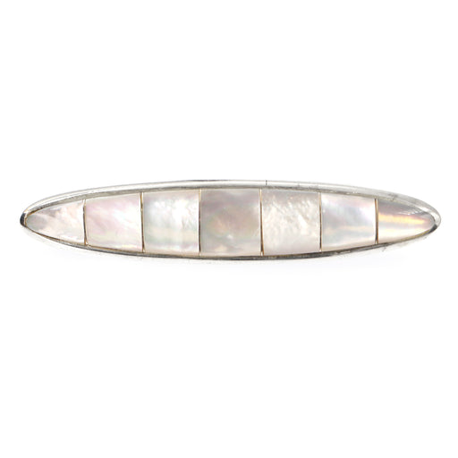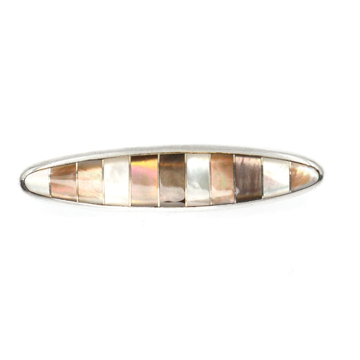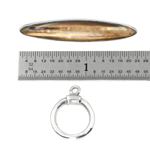 Average size is 42-44 mm long by 9mm wide. This toggle contains mother of pearl and sterling silver.