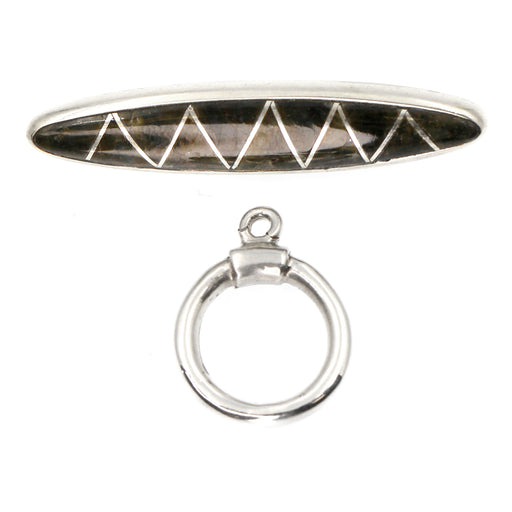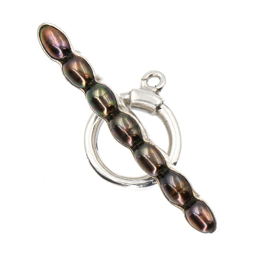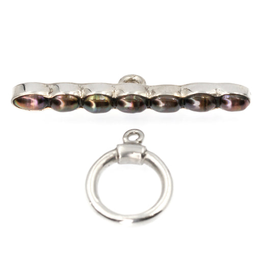 Average size is 42-44 mm long by 9mm wide. This toggle contains Brown, Black and white mother of pearl with the metal being sterling silver.
