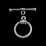 This distinctive sterling silver toggle clasp set features a classic design with an appealing textured finish, perfect for adding a touch of rustic elegance or nautical charm to your jewelry creations. Both the bar and the ring components are crafted with a striking twisted or rope-like texture, highlighted by an antiqued finish that emphasizes the intricate details.