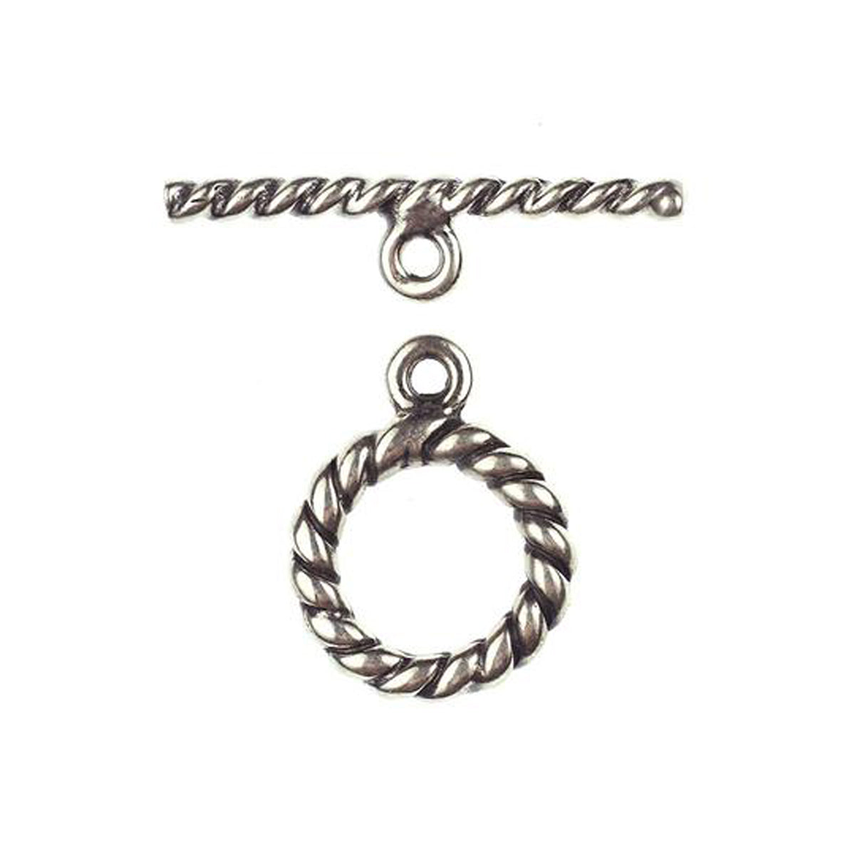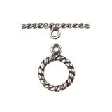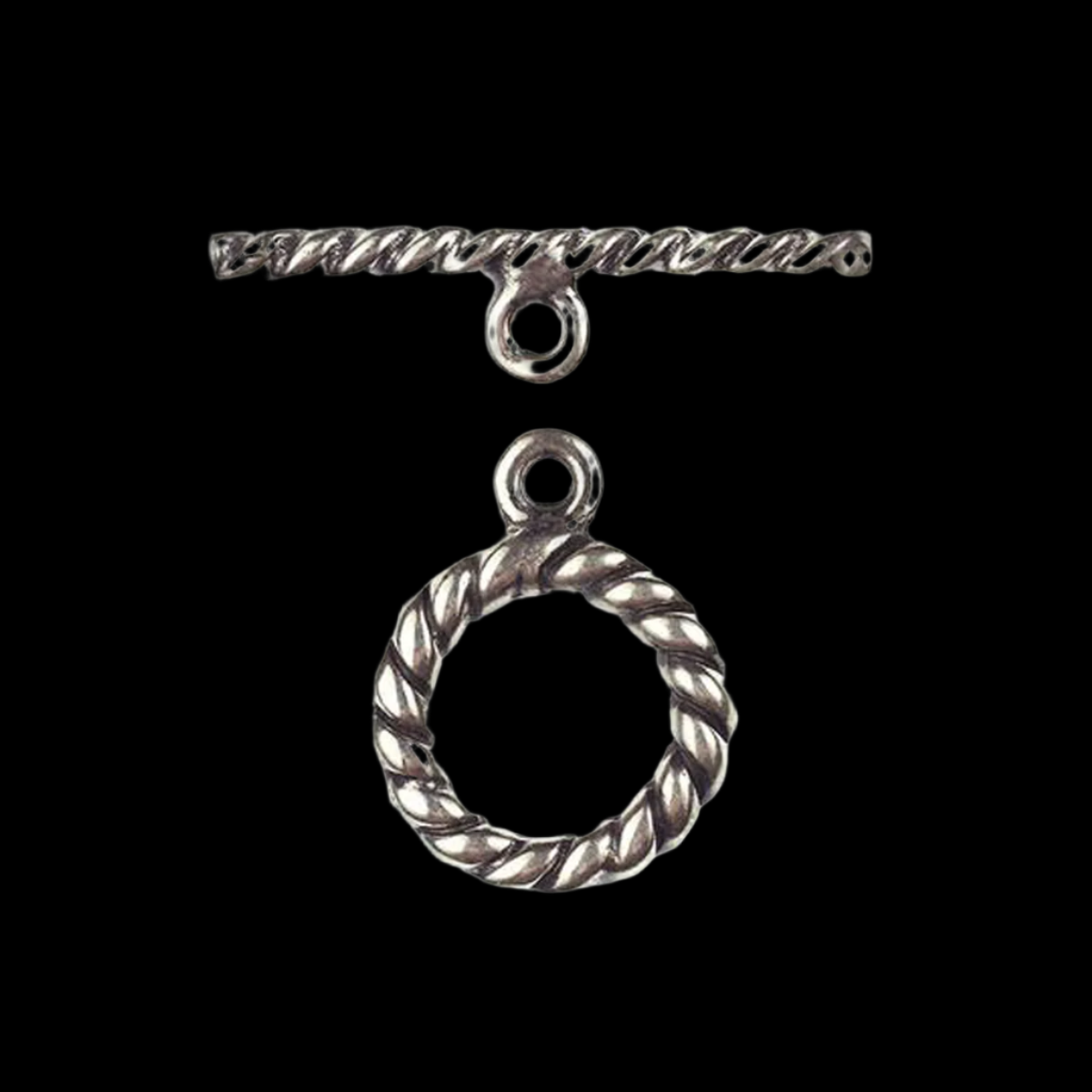 This classic (STG-039) Sterling Toggle Set is a unique and elegant addition to any jewelry design. Both the toggle bar and the ring component are crafted from high-quality sterling silver and feature a captivating twisted rope or spiral texture. The ring is a substantial circular shape with the same intricate twisted detail. This set provides a clean and secure closure for your necklaces and bracelets.